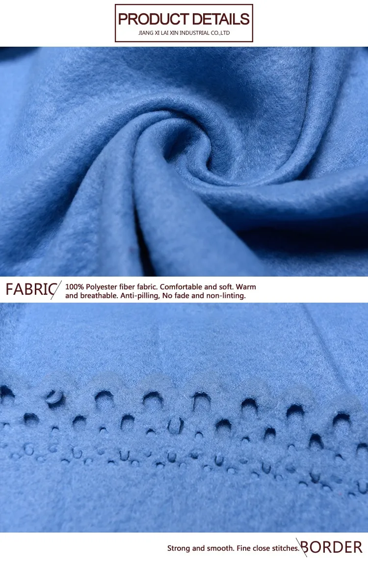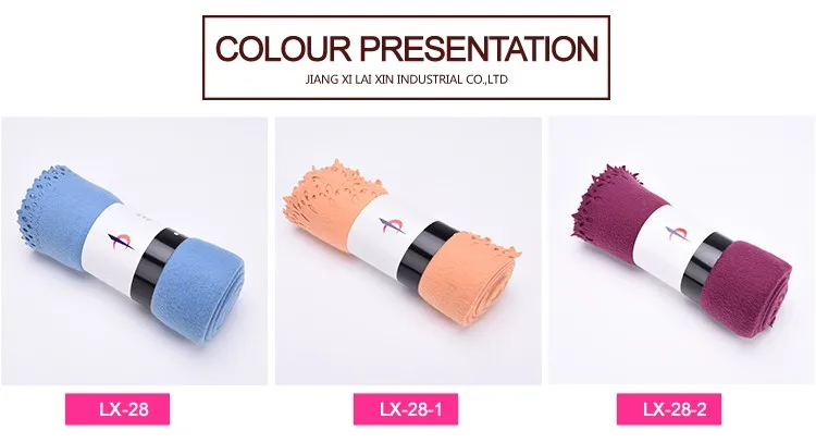 Features | 1. Care of skin 2. Reasonable price of high quality 3. High warmth retention 4. Good choice for gift, promotion, home, and outdoor using 5. Non-toxic, absorbency to skin, high warmth retention 6. Anti-pilling, anti-static, fastness, anti-crease, anti-Allergic 7. Colorful, warm ,soft, suitable for travel use and easy to carry 8.Good choice for gifts, promotional program and home or outdoor use |